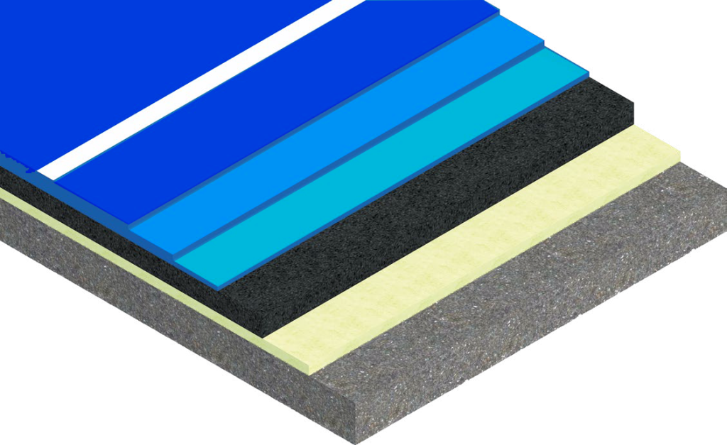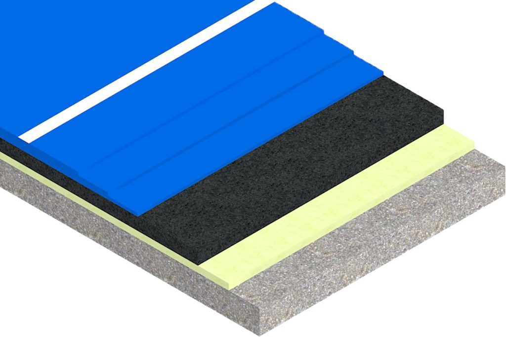 Pavimentazione professionale realizzata con 1 strato di speciale trattamento per rasatura e collante, 2 strati di speciale trattamento cushion e 3 strati di rivestimento sintetico